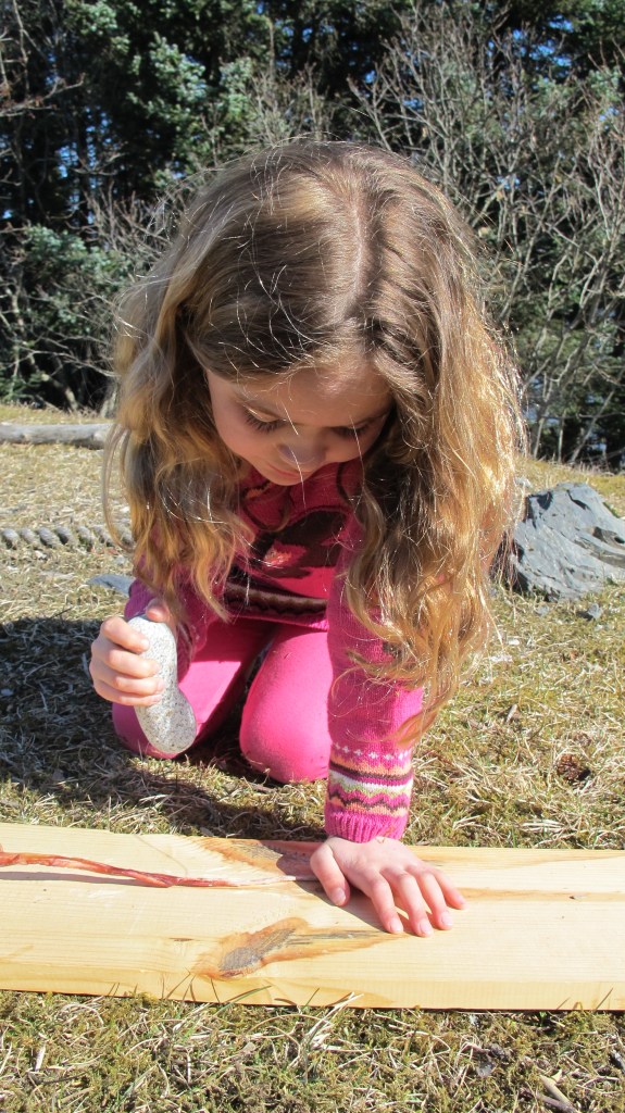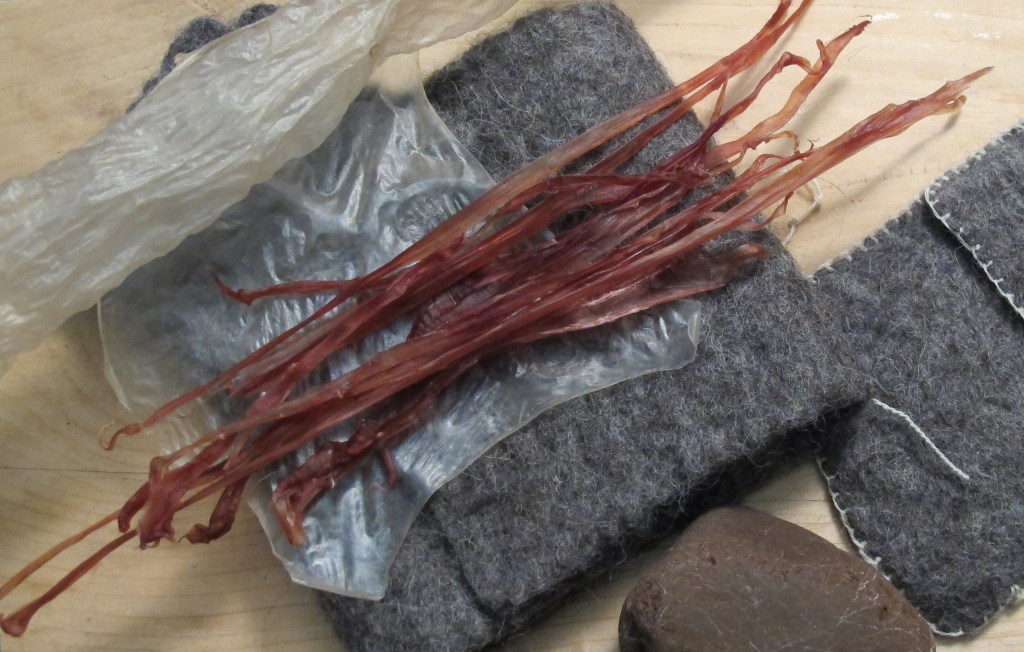 Once I had my pile of dried tendons I started the next stage by hammering a few with a piece of beach rounded granite that looked like a hammer stone. Hammering opens the long fibers and the color changes from red to yellowish off-white.