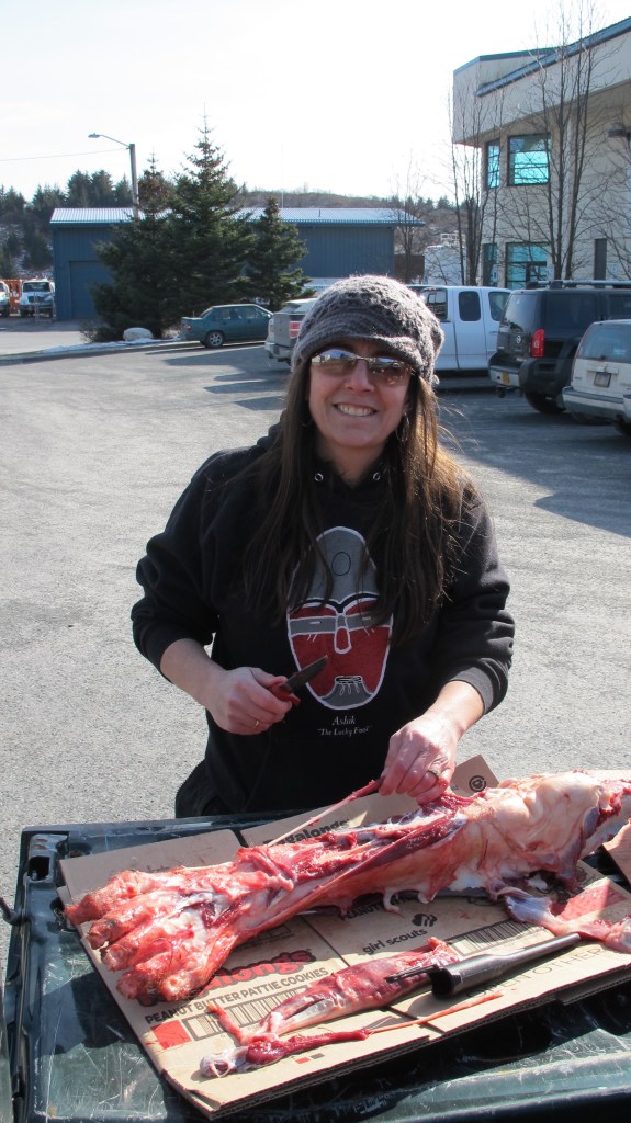 The weather was cold the day this photo was taken and I cut myself a few times and didn’t even know it until my hands warmed. I later learned that the bear blood in my cuts could have carried all sort of nice things like meningitis. My husband just shakes his head.