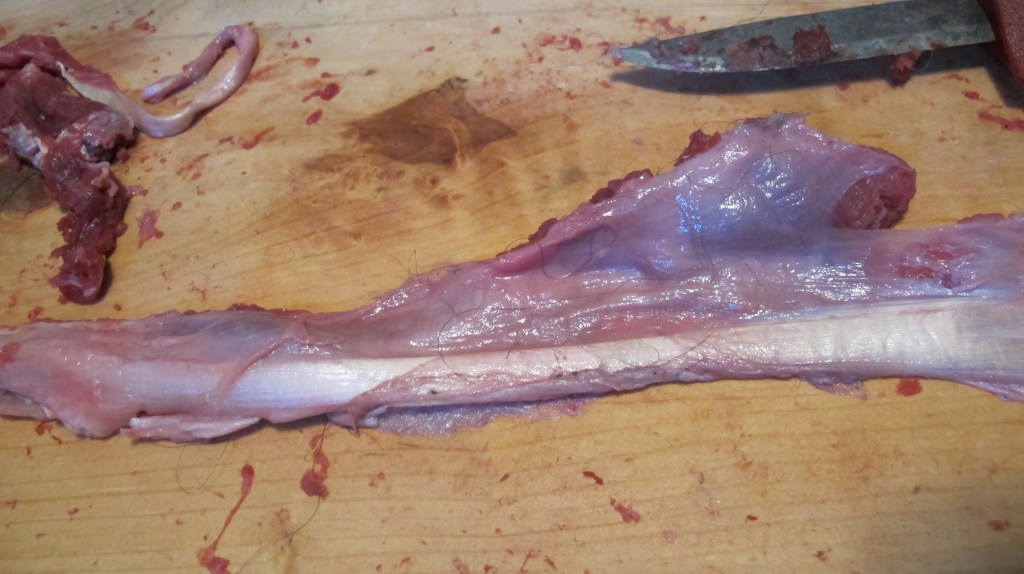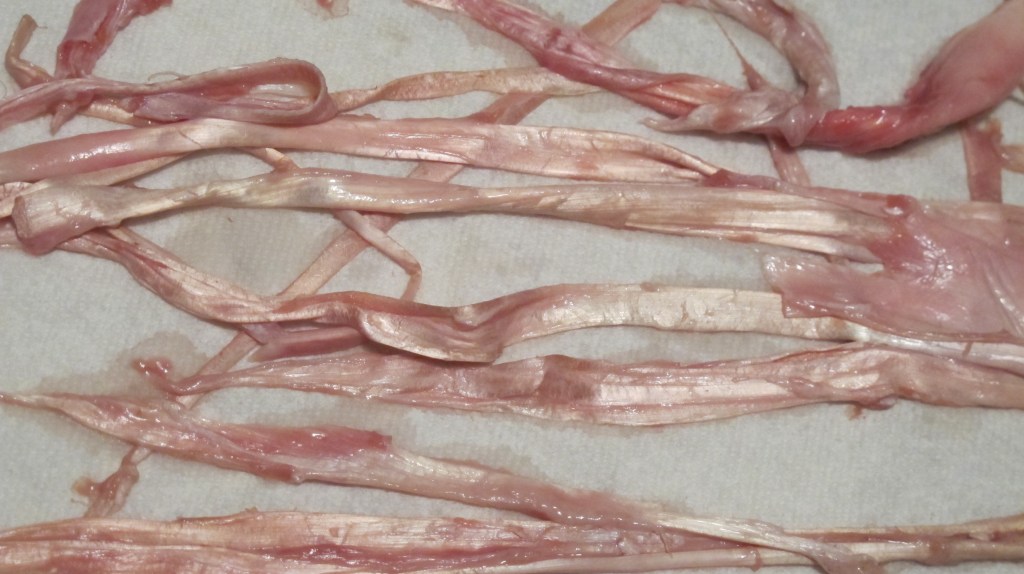 To harvest the tendons you pretty much find them and follow them, end to end, hoping to get the longest pieces possible. I decided to just get the tendons cut out and remove the horrible pesky sheath that covers the tendons in a nice warm place.
