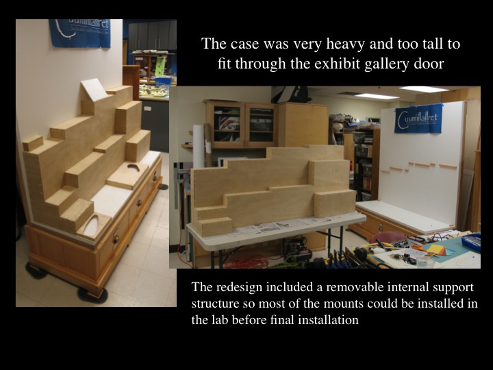 I worked for the Alutiiq Museum and Archaeological Repository in Kodiak, Alaska, for five years. One of the many hats I wore was exhibit designer and fabricator. The “before” image is what the exhibition space looked like when I arrived. The “after” is as it looked as I left. I am very proud of the dramatic changes we were able to achieve in such a short span of time. I am especially proud of the exhibit case detailing the culture through time. I designed and fabricated everything inside from the supports to the brass artifact mounts. I hope the exhibit serves the Museum well for years to come.