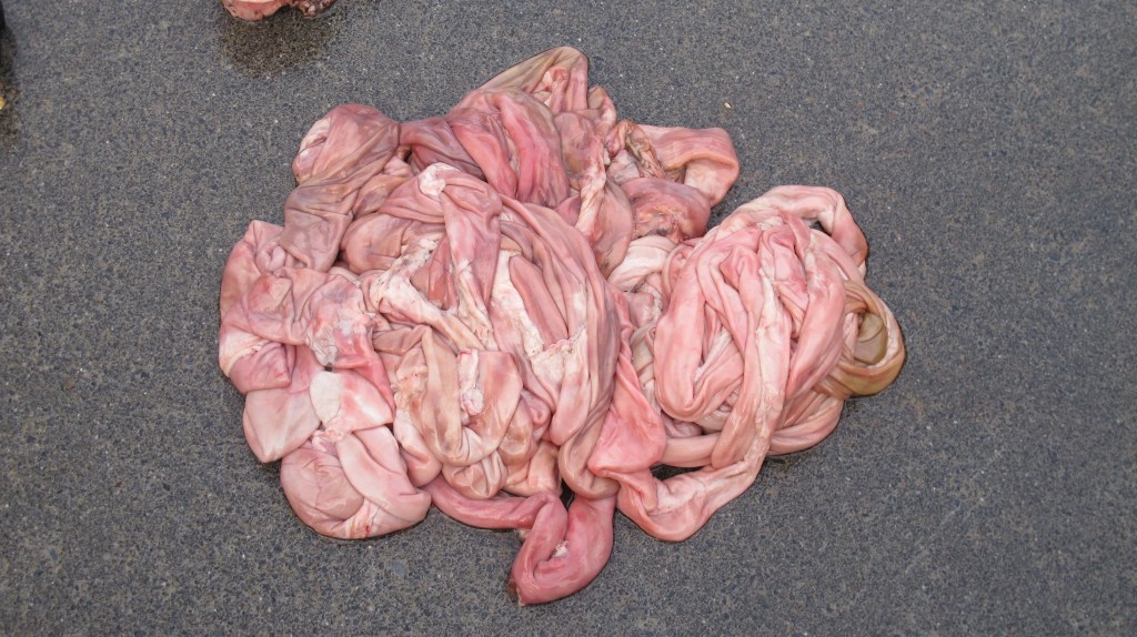 When the intestines are scraped clean (down to the submucosa) they look a lot like pasta and in many parts of Alaska they are stuffed, cooked and eaten like any other sausage casing.