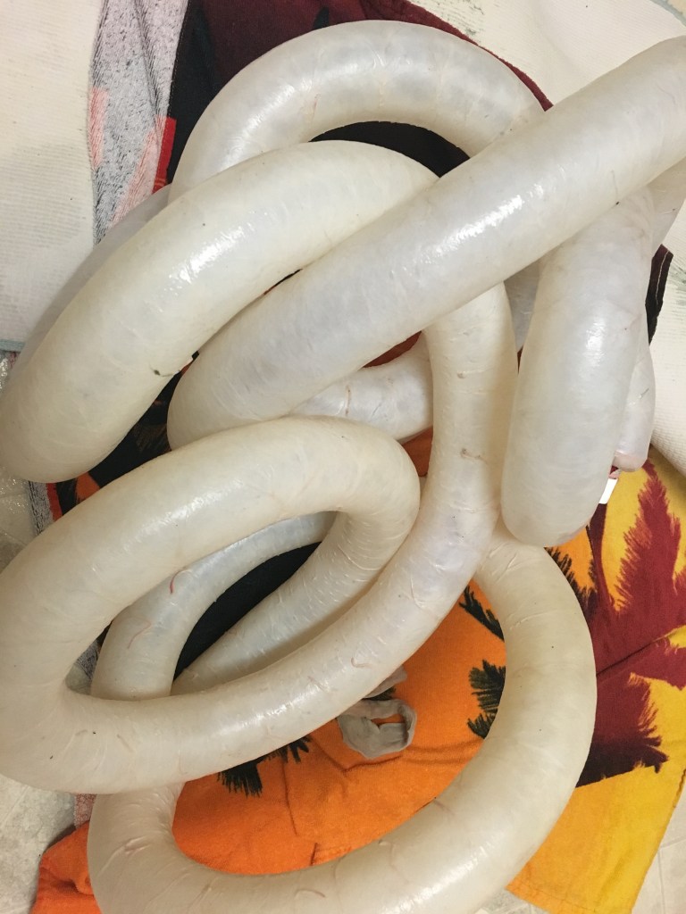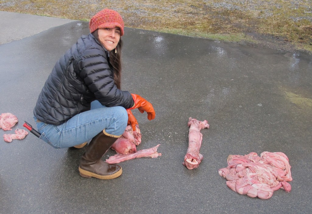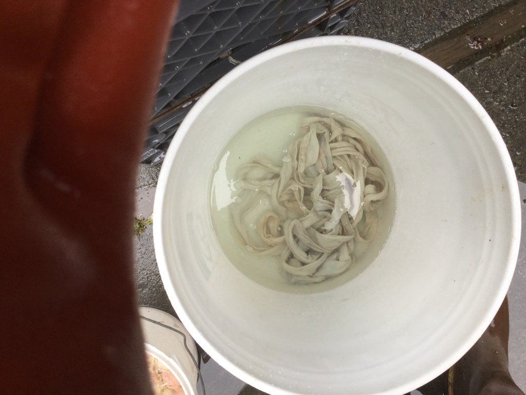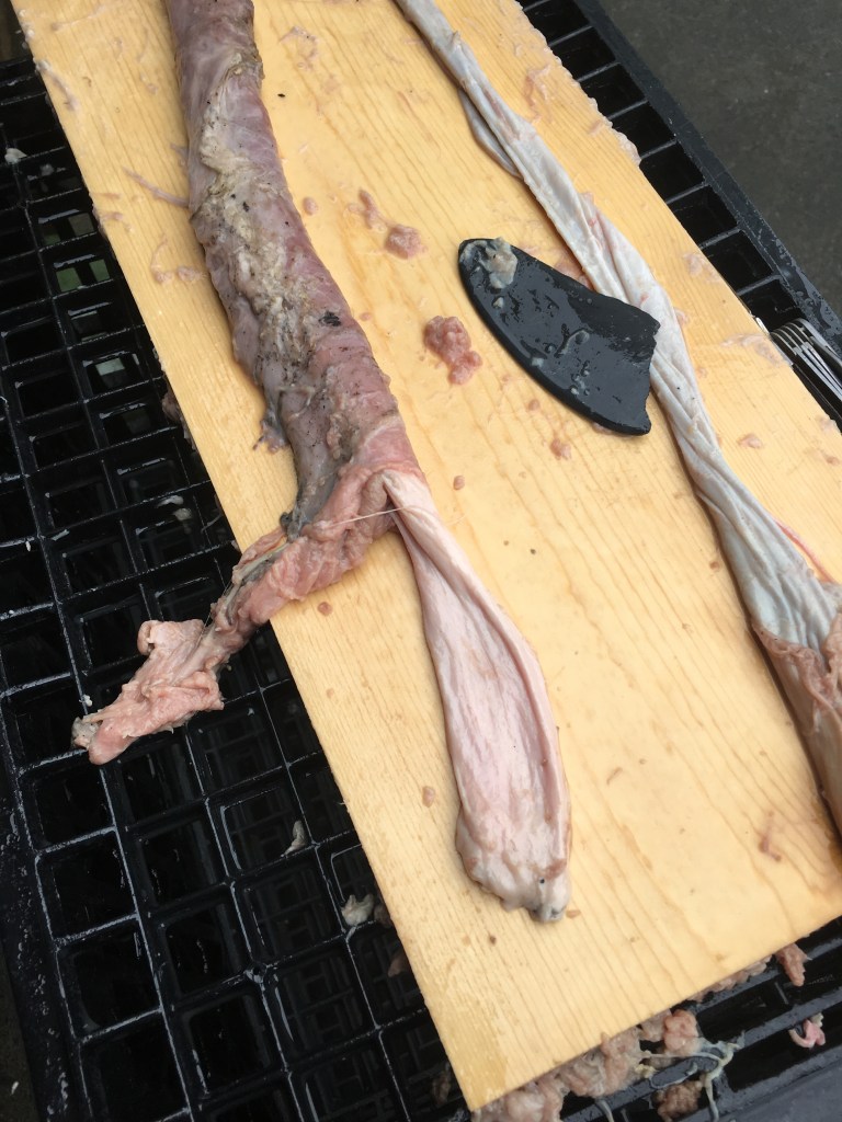 After pulling apart all the connective tissue (peritoneum) the process of scraping both the inside and outside of the gut is fairly straight forward. Through experimentation I figured out how to run water through the gut to turn it inside-out. This is fun and my neighbor’s kids and their cousins really enjoyed helping and watching the gut inflate with water.