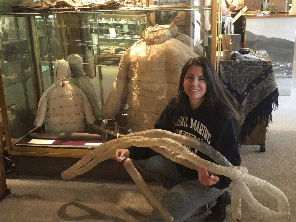For thousands of years this material was sewn by Alutiiq women into waterproof garments and other items essential to thrive in the island’s cold and wet environment.