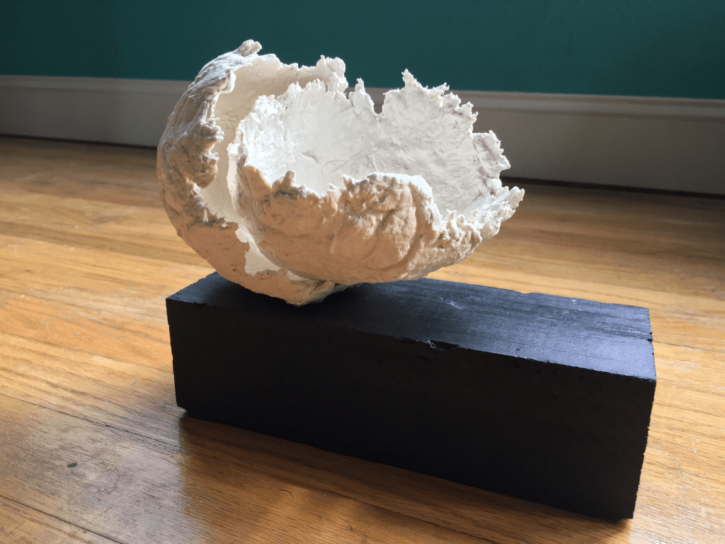 This sculpture is formed out of my hand-made modeling compounds and painted with acrylic paint. The base is scrap wood borrowed from the wood pile at the Kodiak Island Brewery.