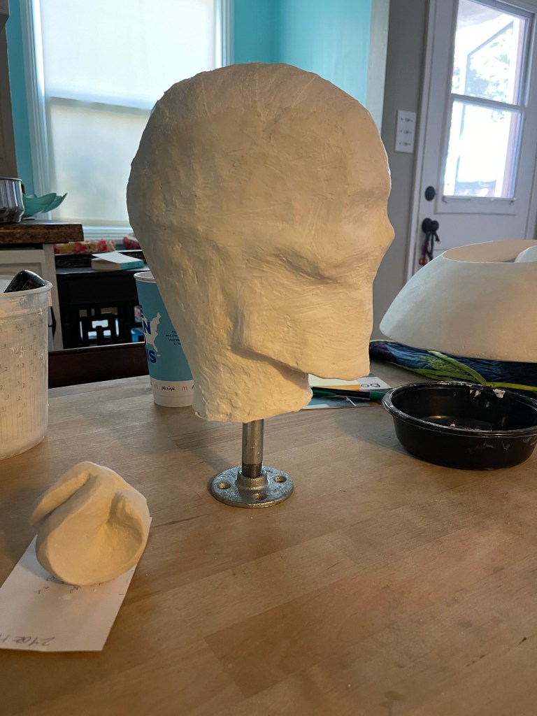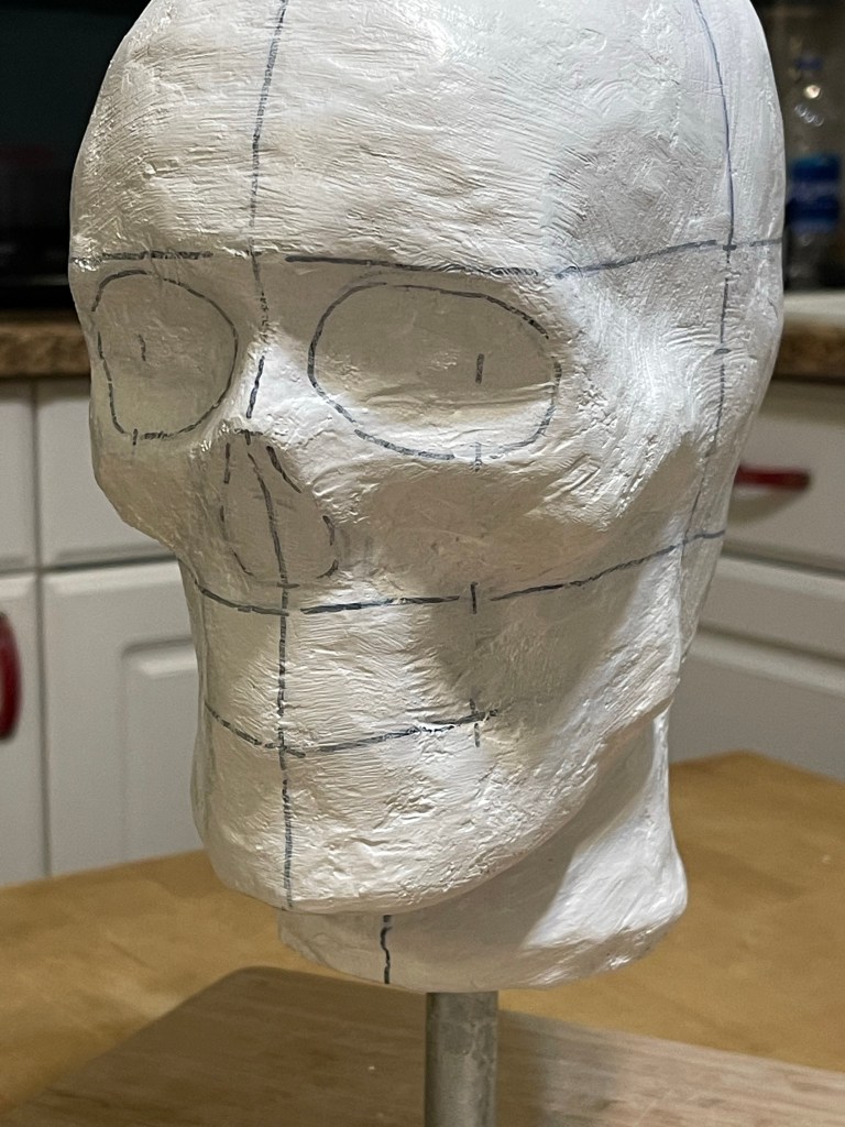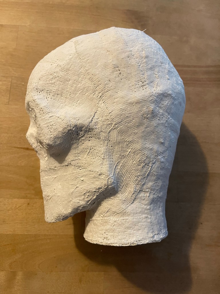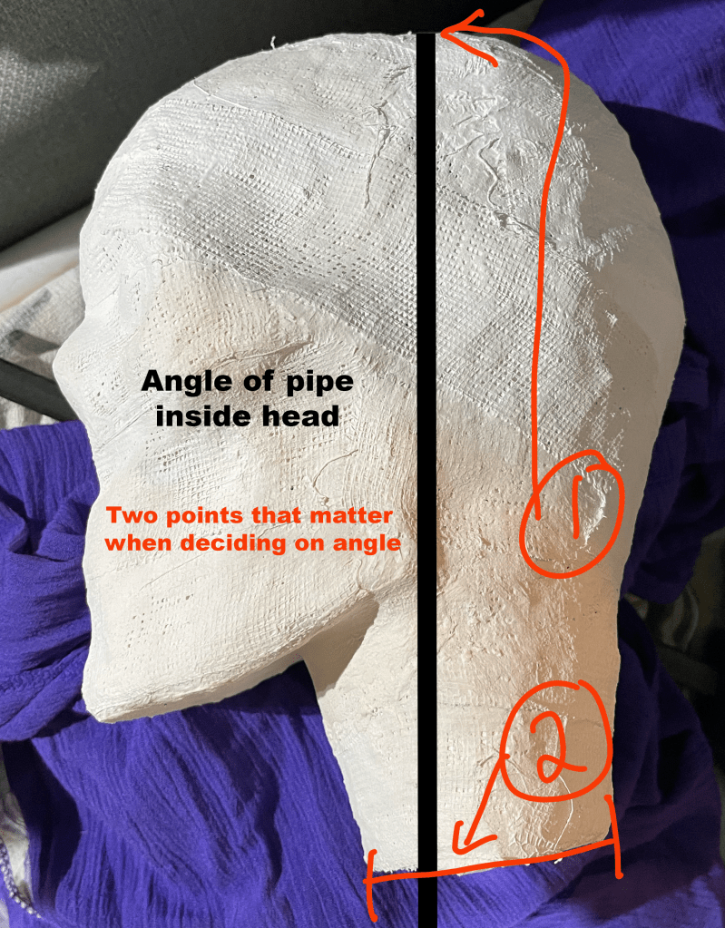 Cereal box paperboard, masking tape, paper, and a McDonald’s coffee cup (neck)It doesn’t need to be perfect – just cover the whole thing in masking tapeThen, cover it in two plus layers of plaster cloth / plaster bandagesOnce dry, cut the plaster cloth off the supportRubber band it all back togetherAdd another layer or two of plaster cloth to reconnect the piecesThe little strings that fray off the plaster bandages are just part of the materialScrew a conduit flange plate into heavy piece of wood, add the pipe, – check the tilt of the head to see what angle to secure the headCoat the outside of the head with plaster, let it dry and shape with files etcetera as you wish.Mix up more plaster and pour it inside your head. Rotate the head so the plaster coats the inner surface.The metal piece in the center of pink rigid insulation board isn’t necessary. You can cut a donut shape in whatever material you’d like to plug the neck around the pipe. This plug will help keep the pipe tilted at the angle that is right for you.Rig a way to hold the pipe at the correct angle while the expanding foam you spray into your head cures. The pink plug should be put in place after you spray the foam. I filled mine and left it overnight – this is how it looked in the morning.Cut off the excess foamCover the pink plug and neck with plaster cloth and shape as you wishI painted the plaster and added lines in permanent marker. The lines are optionalThis is possibly the most confusing part of the construction. These two points will determine the final angle of your head. If you have the angle too far forward or backward your face will not be straight up and down. You probably don’t want your chin tucked down and your forehead tilted downward.This was the first time using the form. It was just what I needed!