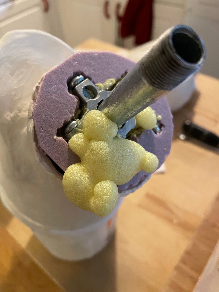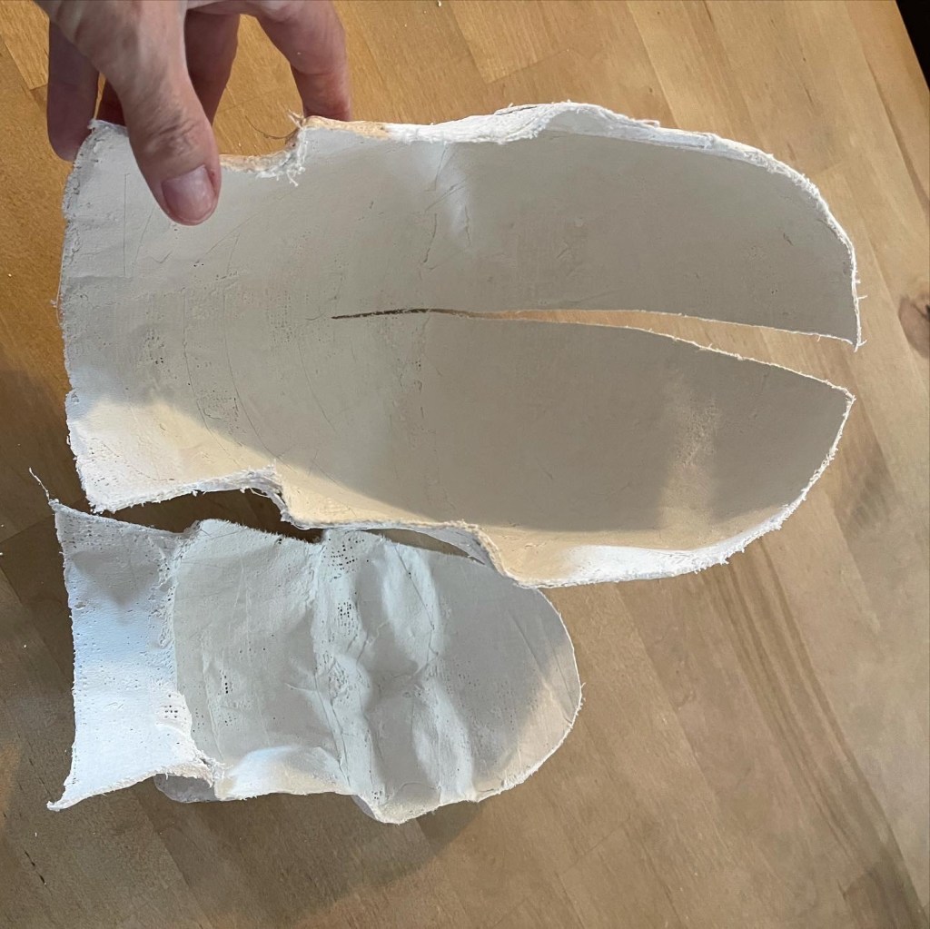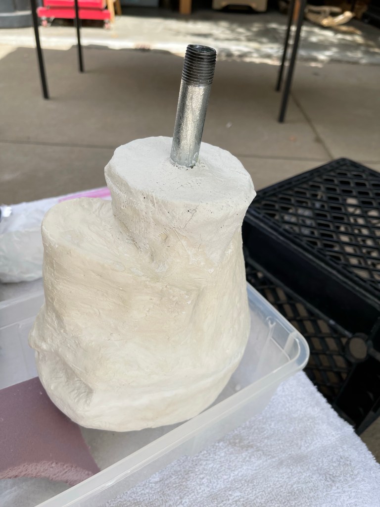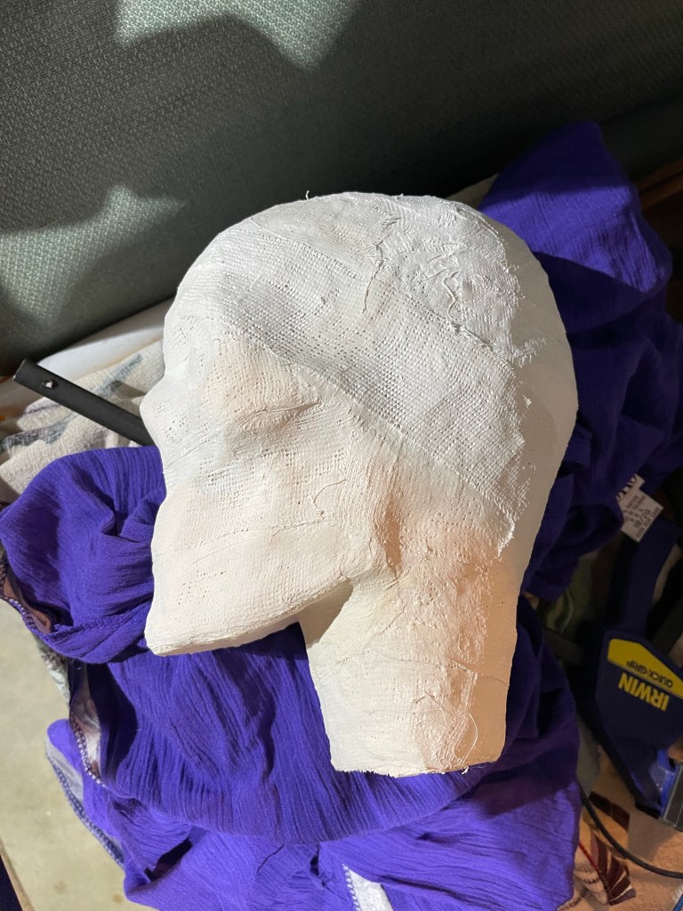 Cereal box paperboard, masking tape, paper, and a McDonald’s coffee cup (neck)It doesn’t need to be perfect – just cover the whole thing in masking tapeThen, cover it in two plus layers of plaster cloth / plaster bandagesOnce dry, cut the plaster cloth off the supportRubber band it all back togetherAdd another layer or two of plaster cloth to reconnect the piecesThe little strings that fray off the plaster bandages are just part of the materialScrew a conduit flange plate into heavy piece of wood, add the pipe, – check the tilt of the head to see what angle to secure the headCoat the outside of the head with plaster, let it dry and shape with files etcetera as you wish.Mix up more plaster and pour it inside your head. Rotate the head so the plaster coats the inner surface.The metal piece in the center of pink rigid insulation board isn’t necessary. You can cut a donut shape in whatever material you’d like to plug the neck around the pipe. This plug will help keep the pipe tilted at the angle that is right for you.Rig a way to hold the pipe at the correct angle while the expanding foam you spray into your head cures. The pink plug should be put in place after you spray the foam. I filled mine and left it overnight – this is how it looked in the morning.Cut off the excess foamCover the pink plug and neck with plaster cloth and shape as you wishI painted the plaster and added lines in permanent marker. The lines are optionalThis is possibly the most confusing part of the construction. These two points will determine the final angle of your head. If you have the angle too far forward or backward your face will not be straight up and down. You probably don’t want your chin tucked down and your forehead tilted downward.This was the first time using the form. It was just what I needed!