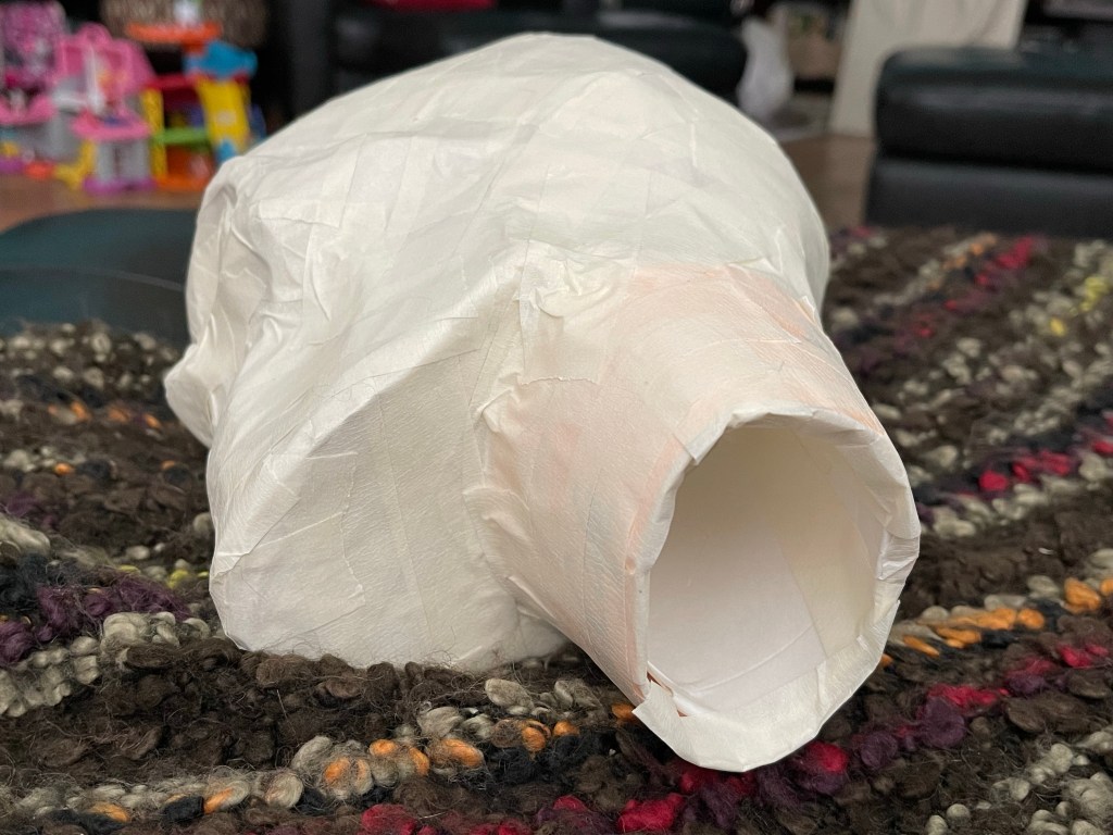 The goal here is to use what you have on hand to make the head. Things you might find in your recycling bin work well, like wadded up paper, cereal boxes and a paper cup. I used cheap dollar store masking tape to cover the base form that I then used to make the plaster cloth form.