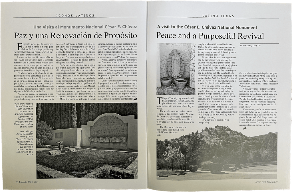 I was suffused with quiet joy in recognizing the care taken in maintaining the courtyard and surrounding trails. At the same time, a part of me left feeling weary knowing the continued poor treatment of farm workers in America and specifically, in the San Joaquin Valley today.